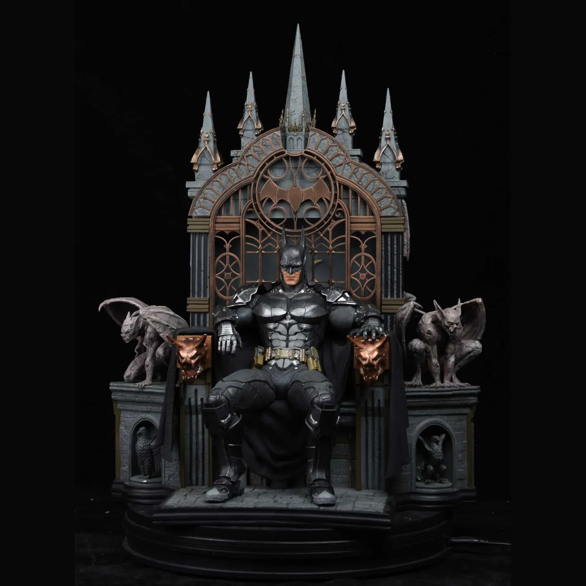 - Epic Throne Diorama: Batman seated in full armor on a gothic-style throne