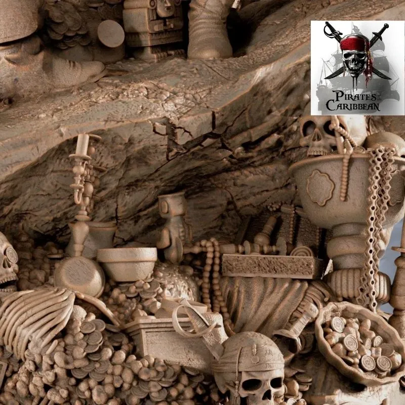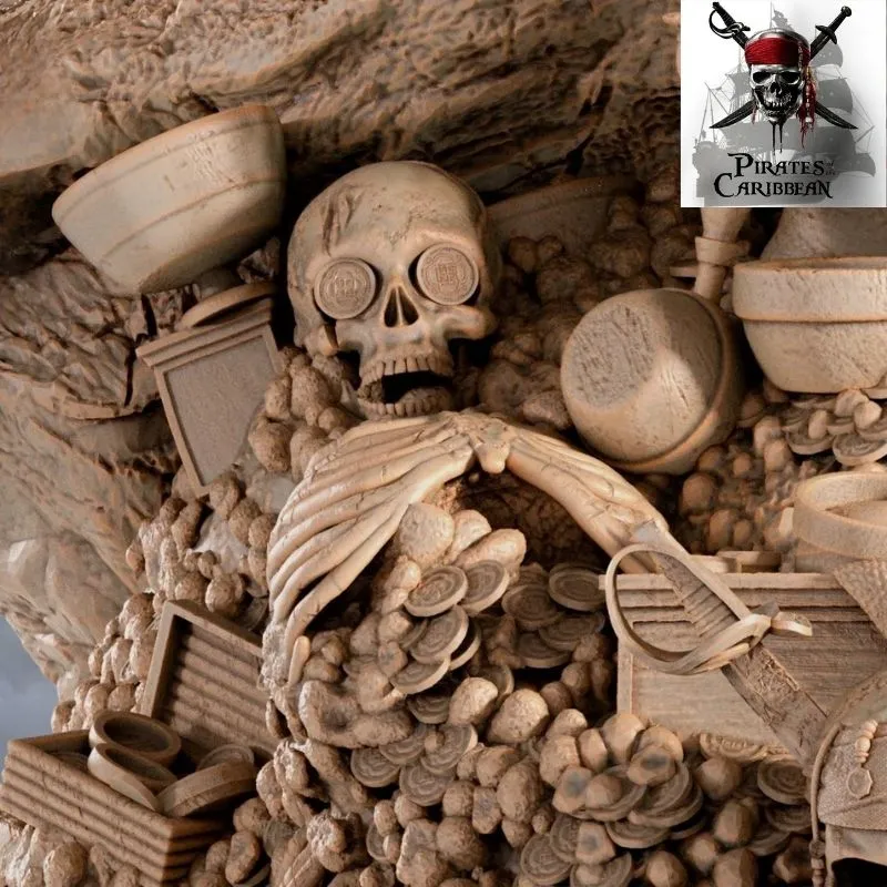 The diorama showcases a highly detailed scene: Jack Sparrow’s iconic stance and charismatic movement, Barbossa’s powerful and aggressive posture, and the famous treasure chest surrounded by gold coins, skulls, goblets, chains, and pirate relics. Every element is sculpted with precision, making this an exceptional centerpiece for collectors, painters, and display enthusiasts.