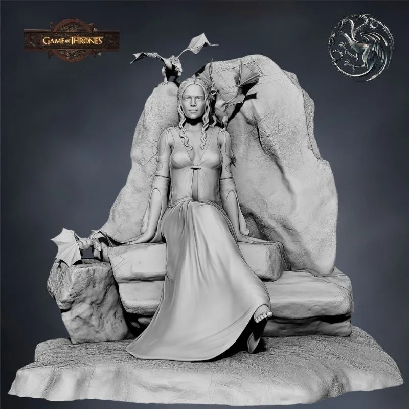 Bring the Mother of Dragons to your collection with this stunning Daenerys Targaryen 3D Model, sculpted in a regal seated pose atop a stone throne surrounded by her young dragons. This gray-coloured unpainted statue captures Daenerys’ elegance, strength, and Targaryen legacy with remarkable realism and artistry.