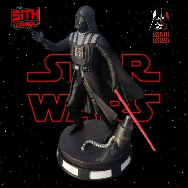 The sculpt showcases screen-accurate Sith armor, from the iconic chest control panel to the flowing cape and mechanical life-support details. The round base features industrial sci-fi elements and cables, reinforcing the cold, mechanical nature of Vader’s reign. This model is designed as a true display centerpiece for Sith-focused collections.