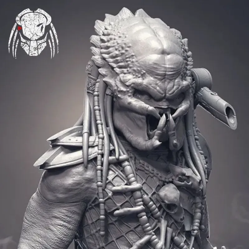 The sculpt features intricate tribal armor, layered leather and metal plating, ceremonial accessories, bone trophies, and the unmistakable Predator bio-mask design. Every surface—from the textured skin and dreadlocks to the armor engravings and wrist blades—has been meticulously modeled for maximum realism and print fidelity.