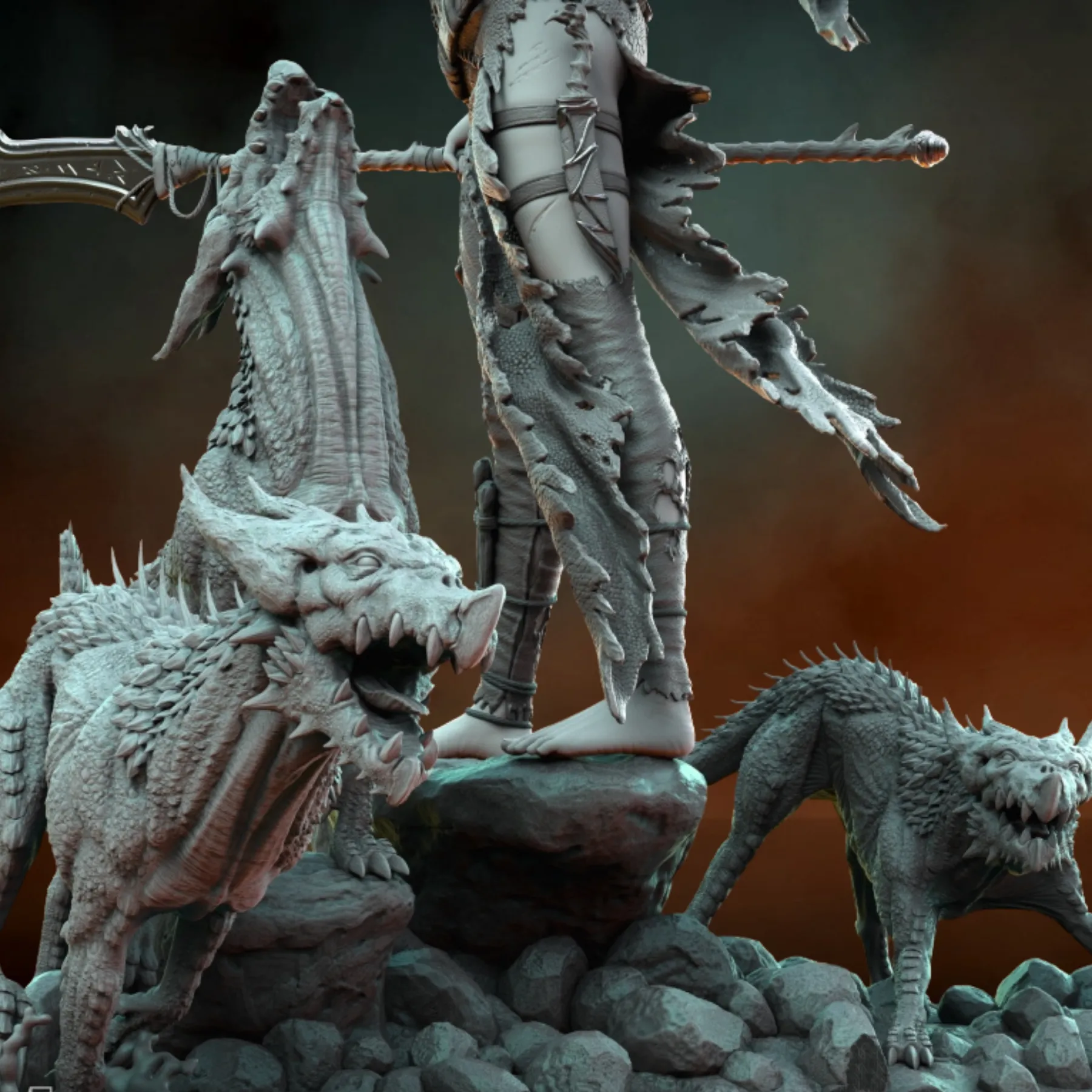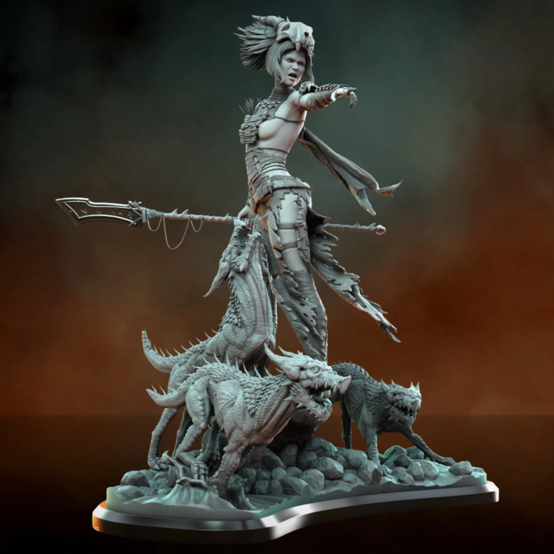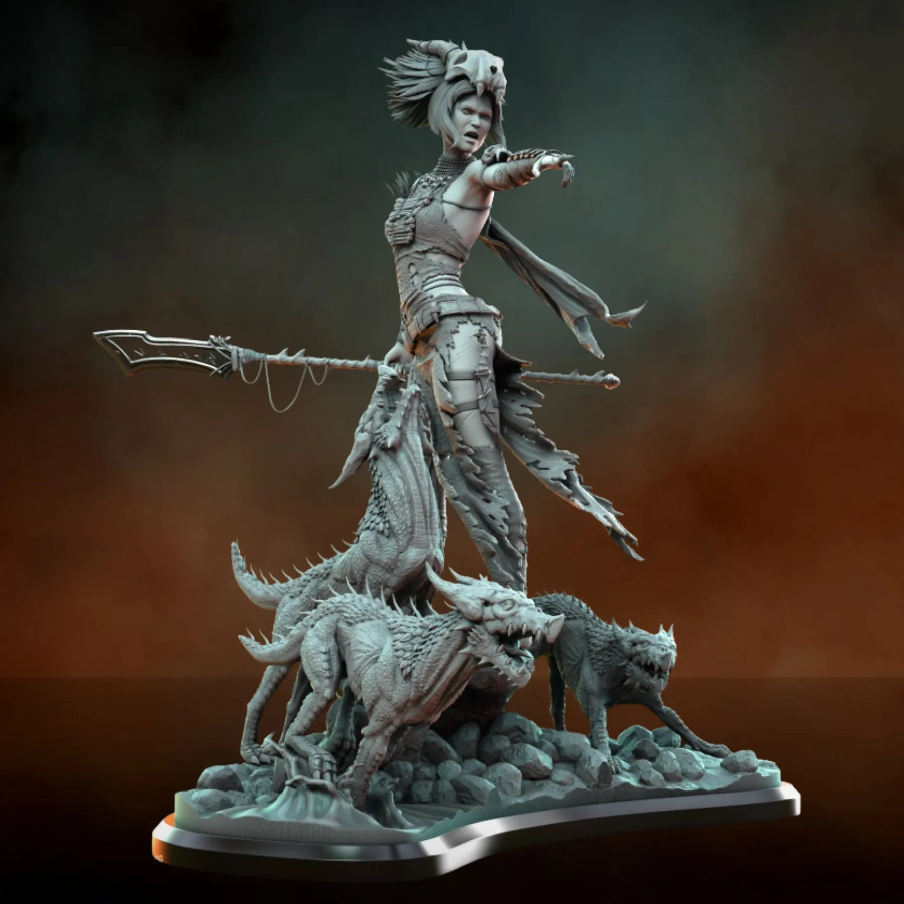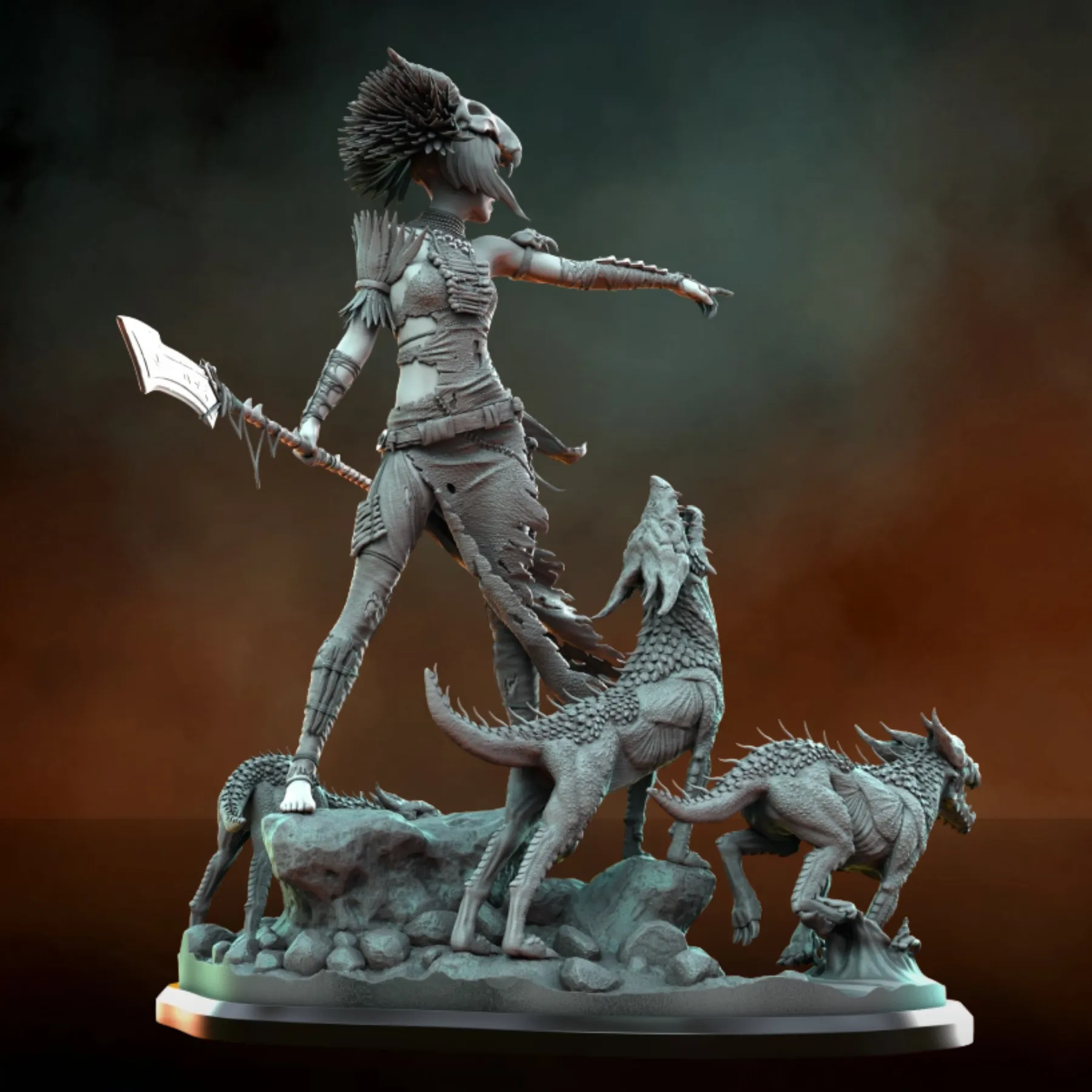 Elzebe is sculpted in a commanding stance atop a rocky terrain base, surrounded by savage beast creatures that reinforce her authority and mythic presence. Every element—from layered leather armor and bone adornments to expressive facial detail and creature anatomy—has been meticulously crafted for painters and collectors seeking depth, storytelling, and realism.