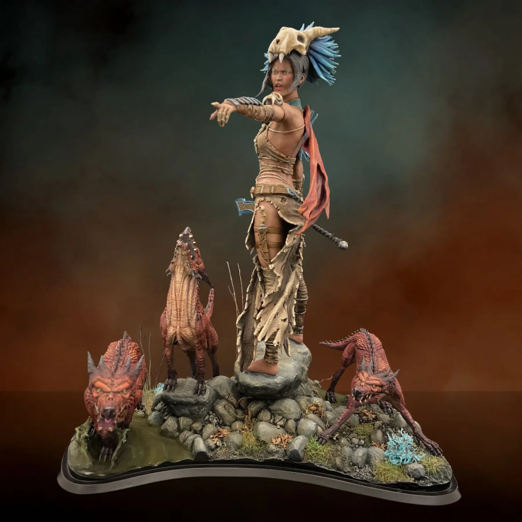 Command the battlefield with Elzebe the Warrior Queen, a powerful dark-fantasy diorama portraying a fearless tribal ruler standing in dominance over her domain. This original character design blends raw primal strength, ancient ritual armor, and feral companions, creating a striking centerpiece for high-end fantasy collections.
