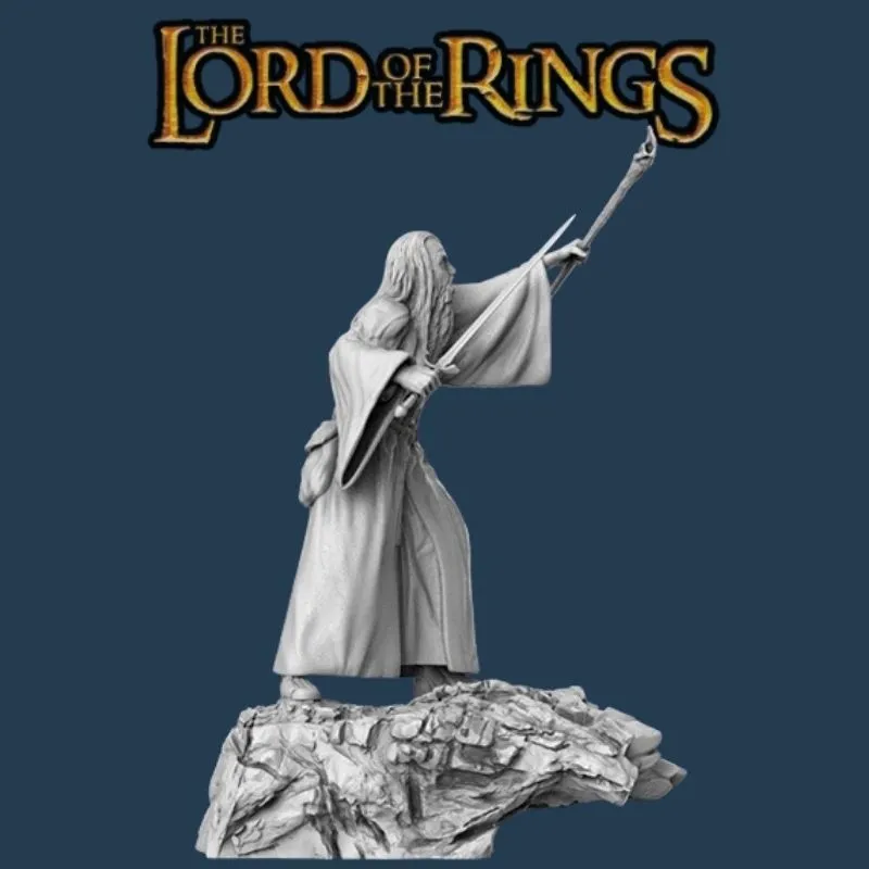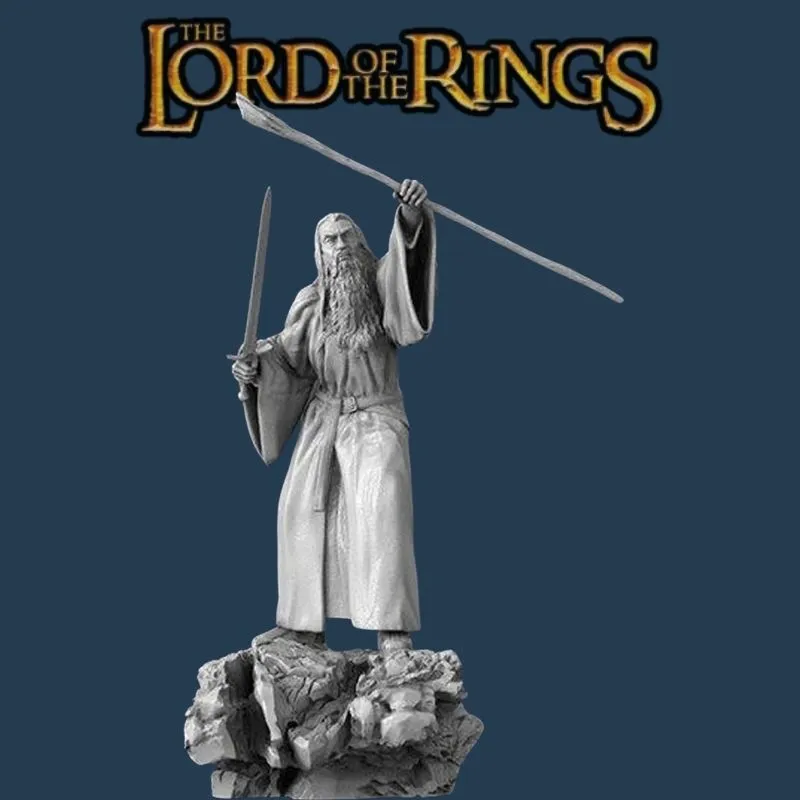 Meticulously crafted with fine texturing across his robes, beard, accessories, and rocky base, this model arrives unpainted in gray, offering painters and collectors a perfect canvas to bring the iconic wizard to life.
