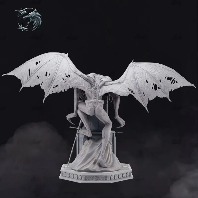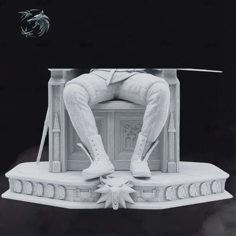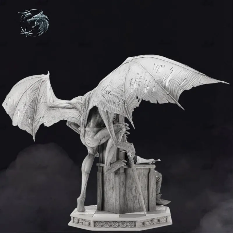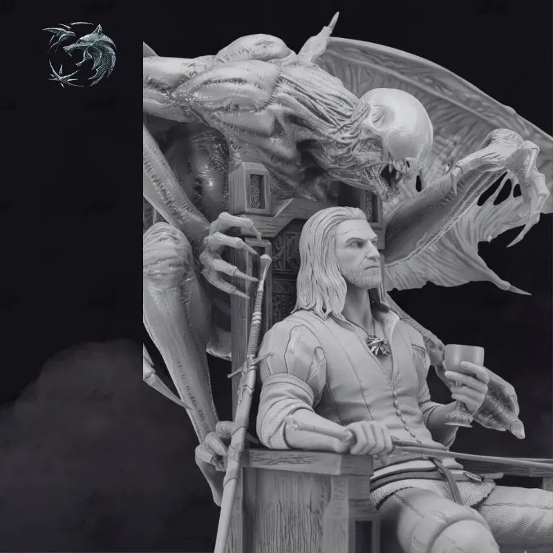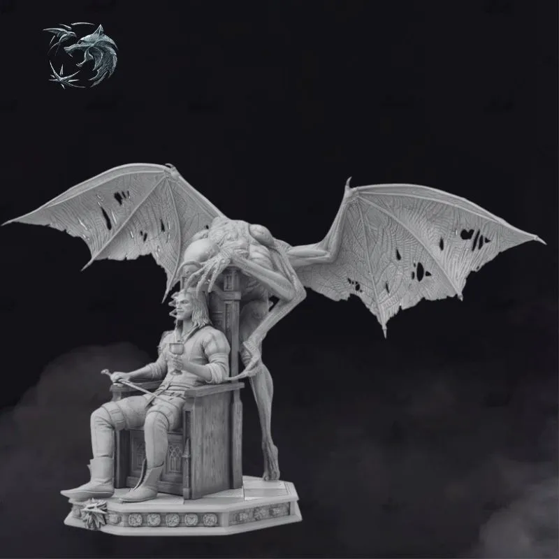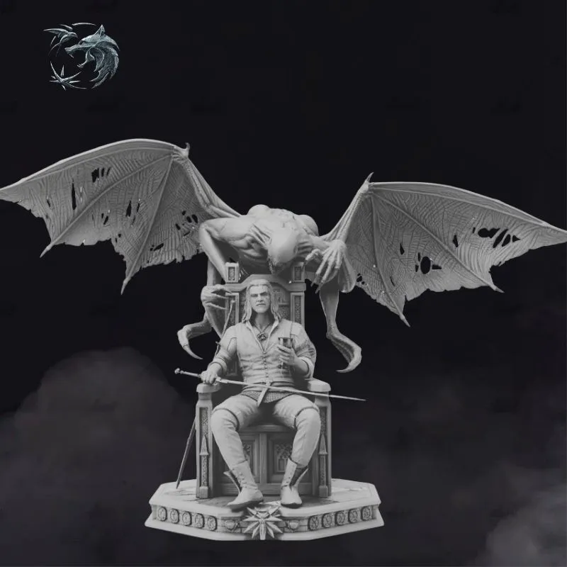 The sculpt blends dark fantasy and gothic storytelling, pushing beyond the traditional witcher-hunter narrative into a realm of power and symbolism. From the intricately carved throne, the relaxed yet commanding seated pose, to the highly detailed demonic anatomy—torn wings, sinewy muscles, and menacing posture—every element is crafted for maximum visual impact.