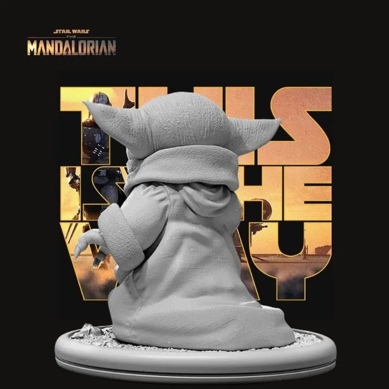 The sculpt showcases exceptional detail, from Grogu’s expressive eyes and large ears to the natural folds and textures of his robe. Mounted on a simple round base, the figure is perfectly balanced for display while remaining ideal for custom painting projects.