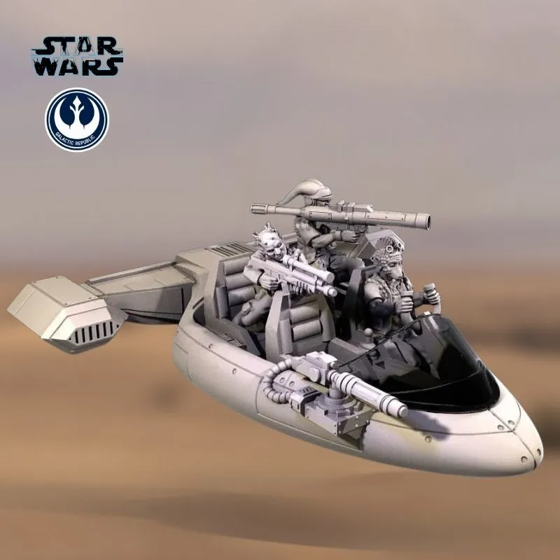 Bring asymmetric warfare to your Star Wars collection with the Guerrilla Combat Speeder, a fast-attack hover vehicle operated by insurgent and resistance forces across desert and frontier worlds. This dynamic 3D printed model depicts a three-member strike team in mid-engagement, perfectly capturing the chaos and urgency of hit-and-run tactics used against superior enemies.