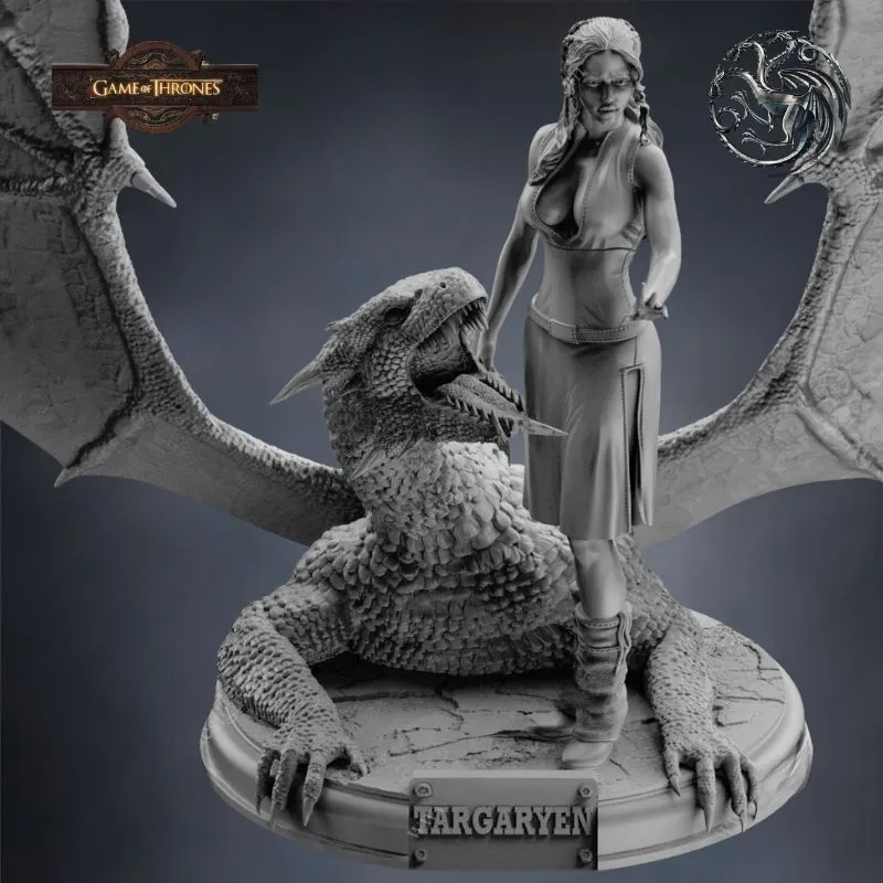 Command the power of House Targaryen with this stunning Khaleesi Targaryen 3D Model, featuring the Mother of Dragons standing beside one of her fierce dragons in a majestic display pose. Sculpted with exceptional attention to detail, this unpainted gray model highlights Daenerys’ iconic blue dress, her flowing braided hair, and the powerful presence of her dragon companion.