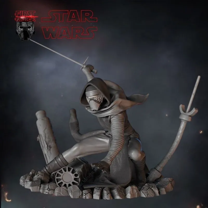 Unleash the raw power of the Dark Side with this Kylo Ren 3D printed collectible statue, inspired by the conflicted warrior of the First Order. Captured in a dramatic, battle-ready pose, Kylo Ren kneels atop shattered debris, brandishing his iconic crossguard lightsaber as sparks of rage and control collide.