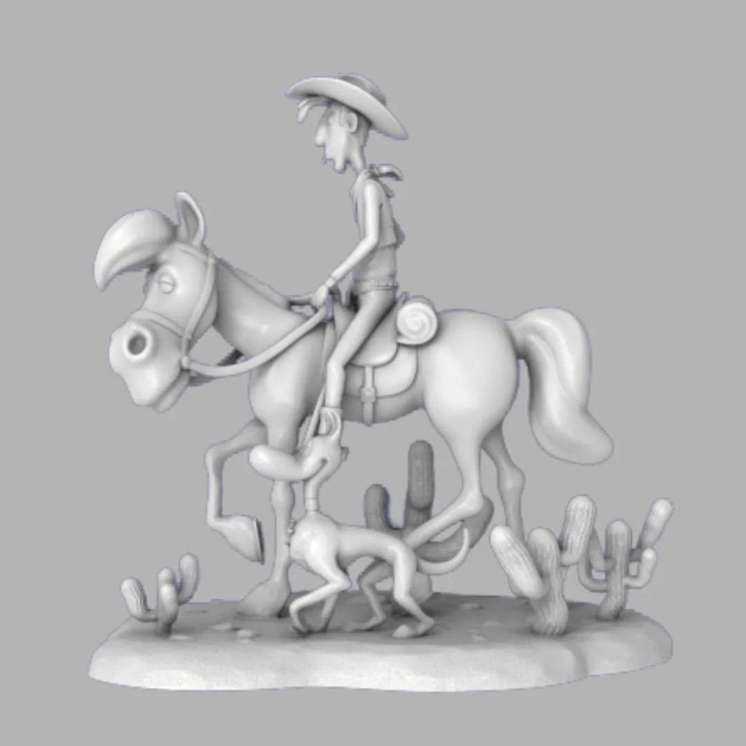 Ride into the Wild West with this detailed Lucky Luke 3D Model, inspired by the legendary Franco-Belgian comic series. This collectible diorama features Lucky Luke riding his loyal horse Jolly Jumper, accompanied by the faithful dog Rantanplan, set against a desert-style base. Delivered in a Gray unpainted edition, this model is perfect for collectors and hobbyists who want to customize, paint, and bring their own artistic vision to life.