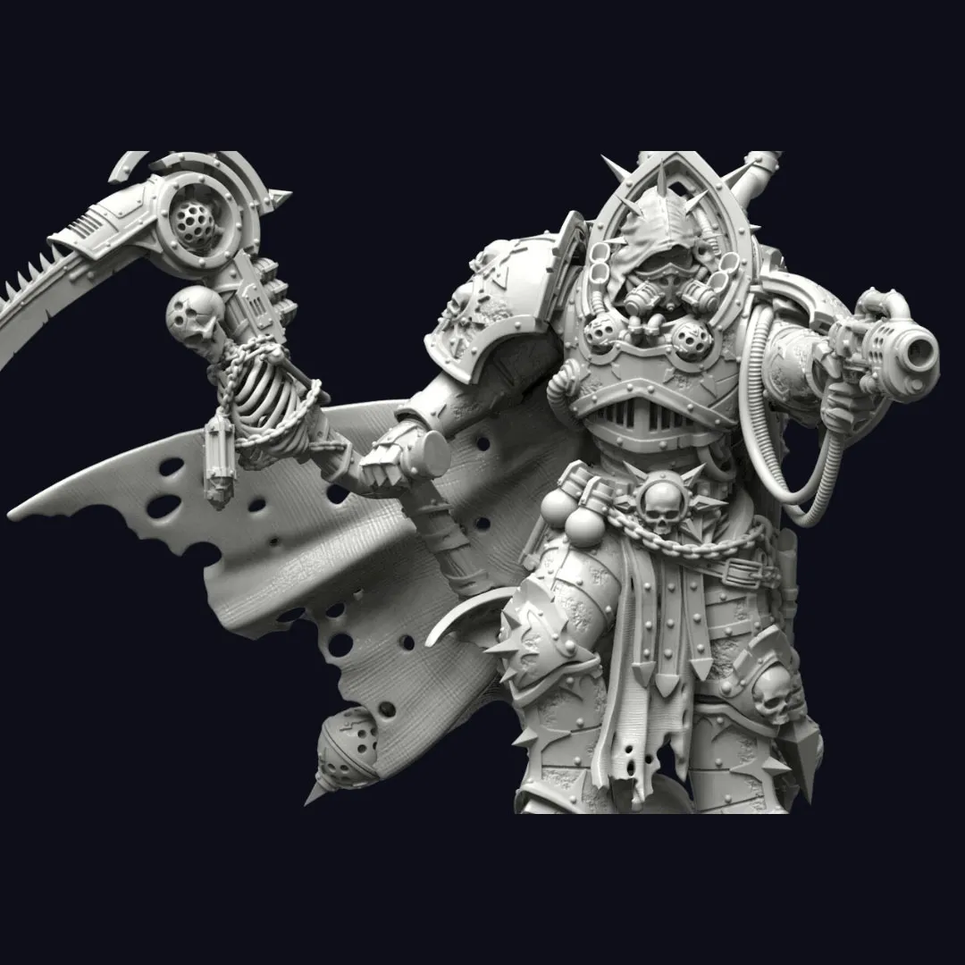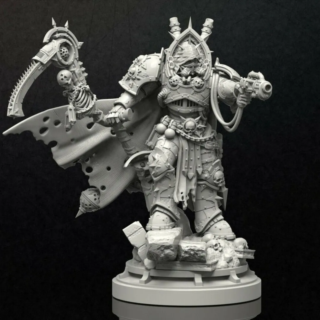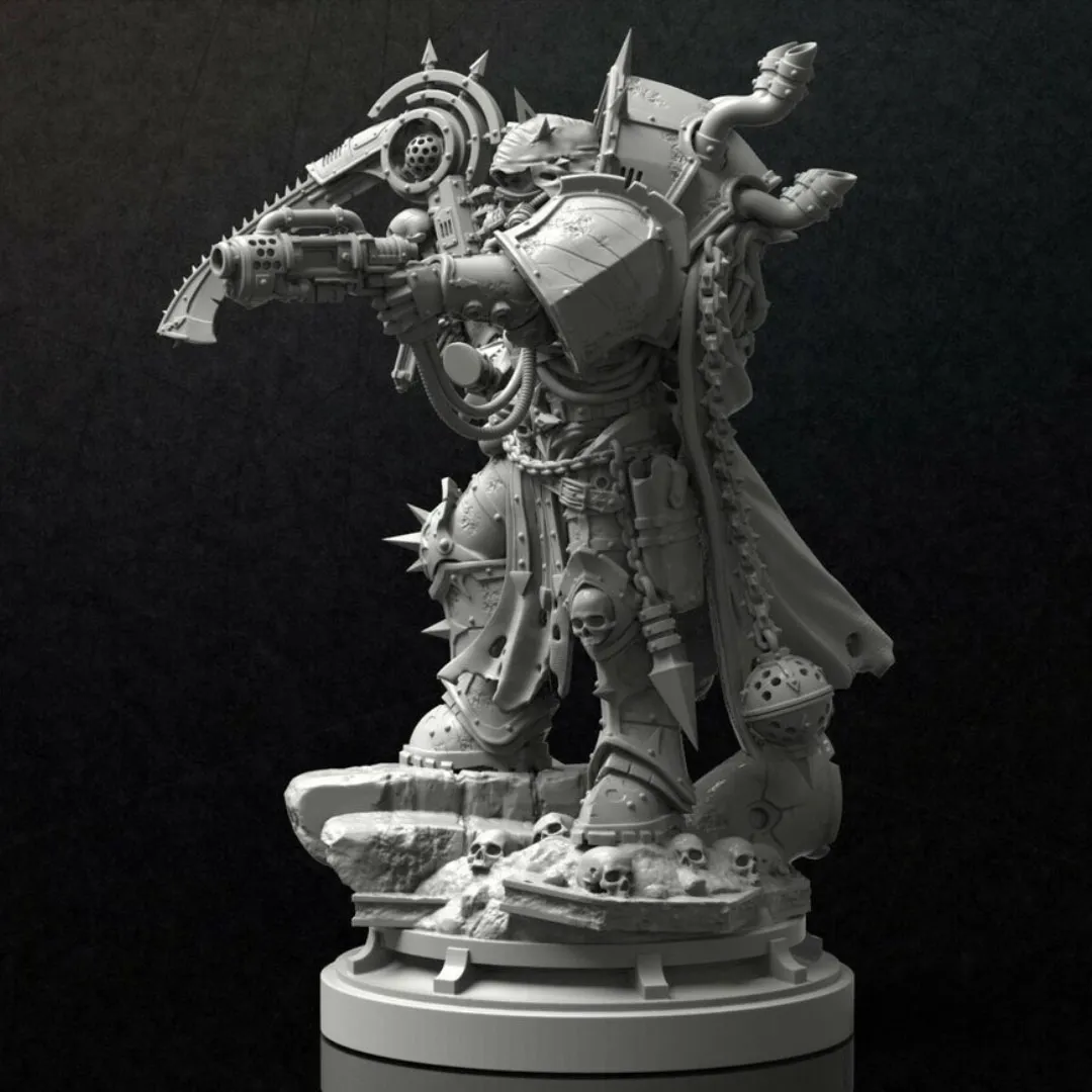 Every element of this sculpt emphasizes weight and presence: the layered armor plating, corrupted details, skeletal trophies, industrial tubing, and brutal weaponry make this model a true centerpiece. Designed for advanced painters and collectors, it is perfect for showcasing weathering, rust, corrosion effects, and grimdark color schemes.