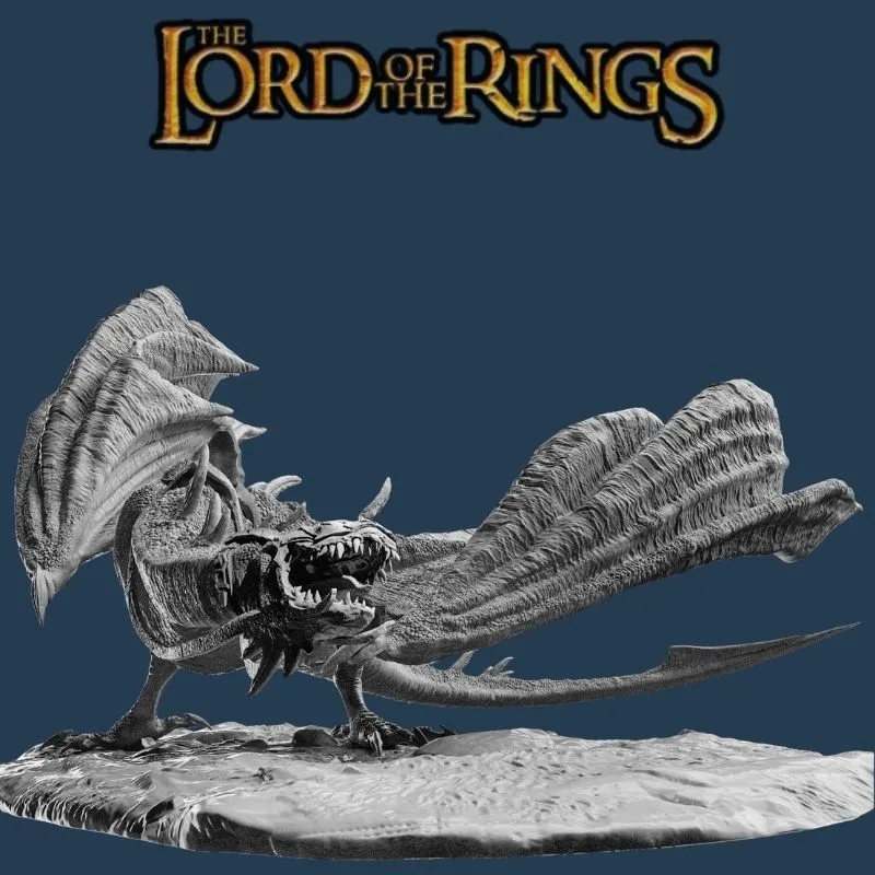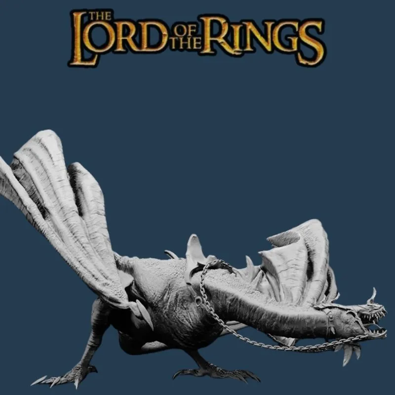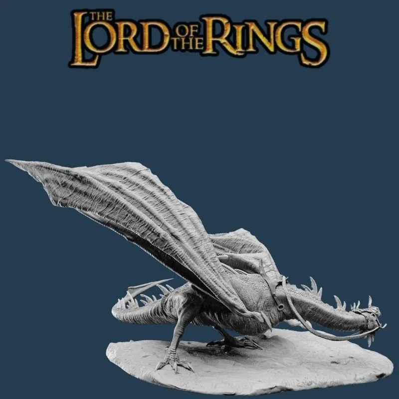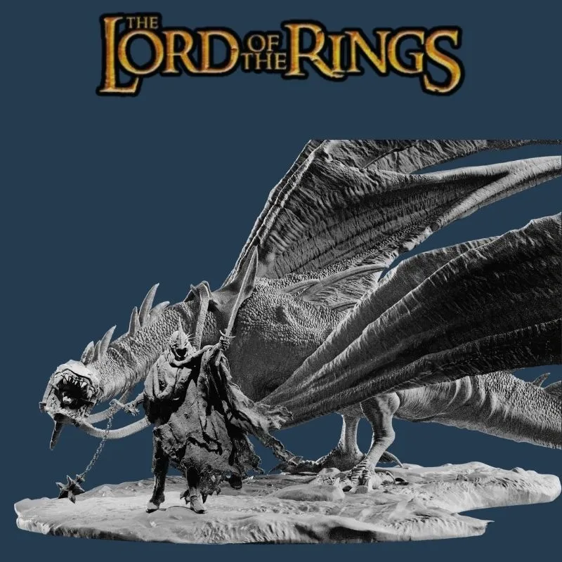 The Nazgûl stands poised beneath the creature, cloaked in shredded robes, wielding his sword and flail with dark authority. Every scale, fold, and weapon detail is sculpted to exceptional realism. Delivered unpainted in gray, this collector-ready model is ideal for painters seeking a dramatic centerpiece.