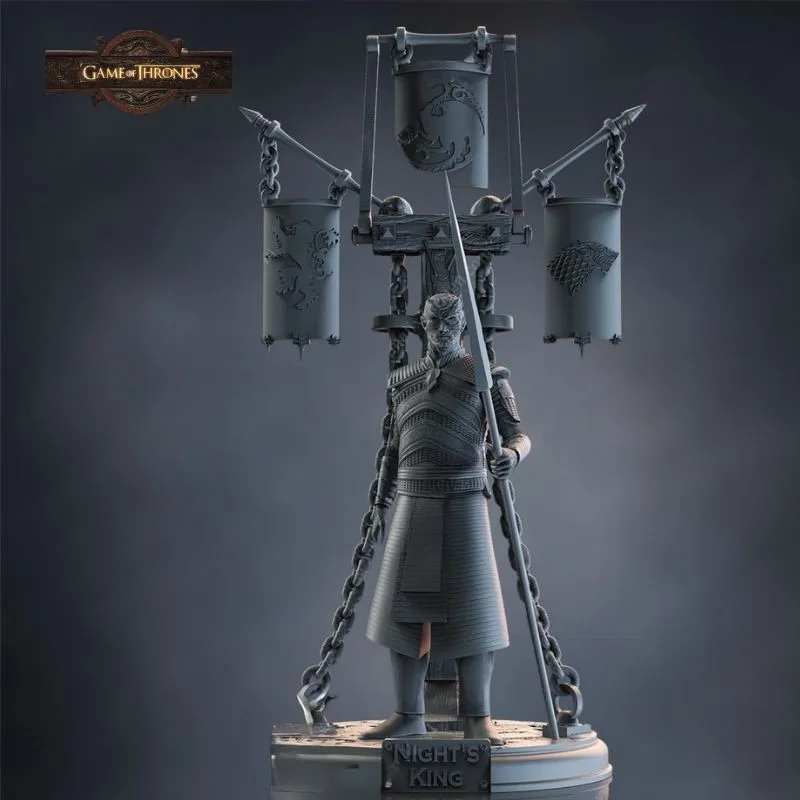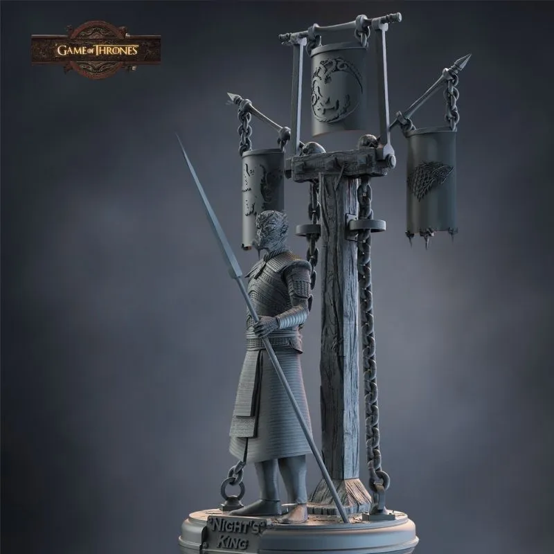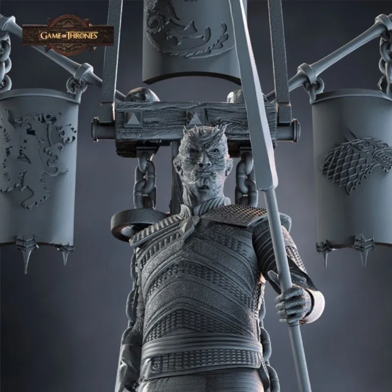 Bring the chilling presence of the Night King, the supreme leader of the White Walkers, into your collection with this stunningly sculpted Game of Thrones 3D model. Standing in front of an imposing banner structure representing the great Houses of Westeros, this figure captures the eerie calm, deadly precision, and icy majesty that define the Night King.