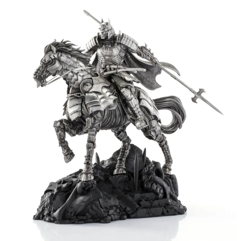Highly detailed sculpt featuring layered armor plates, weapon detailing, horse anatomy, and fabric flow