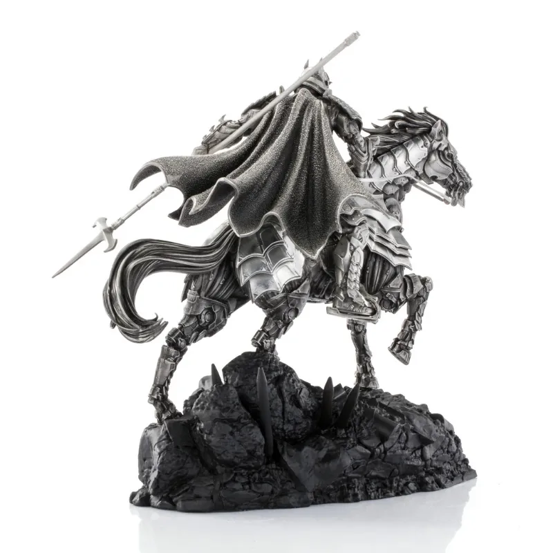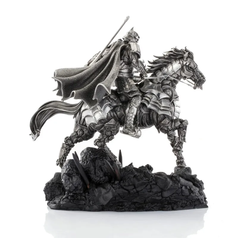 Every detail is sculpted with precision: layered plate armor, engraved pauldrons, flowing cape, reinforced barding on the horse, and a long polearm poised for a decisive strike. The dynamic rocky battlefield base enhances the sense of motion and dominance, making this an exceptional display piece for collectors and painters alike.