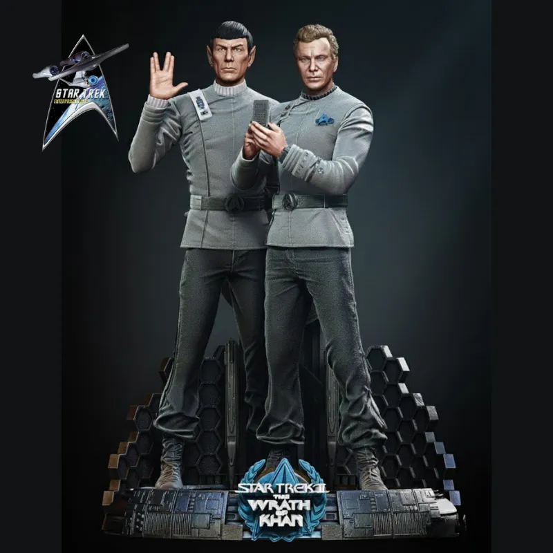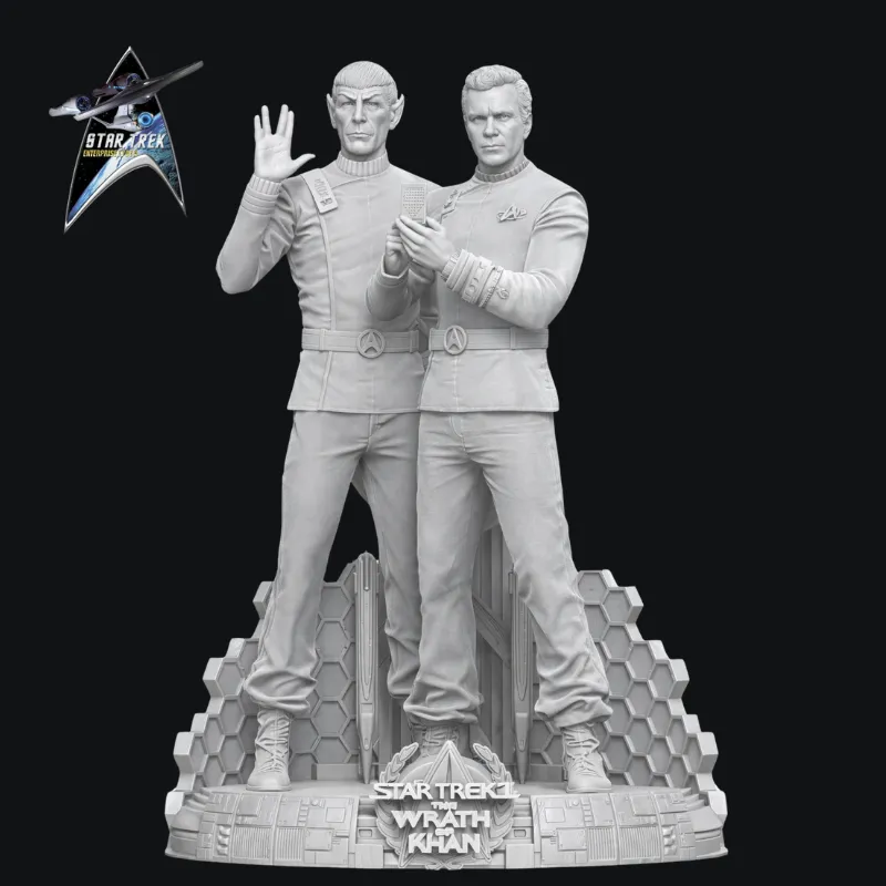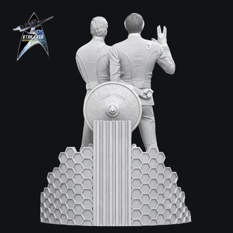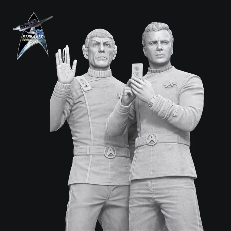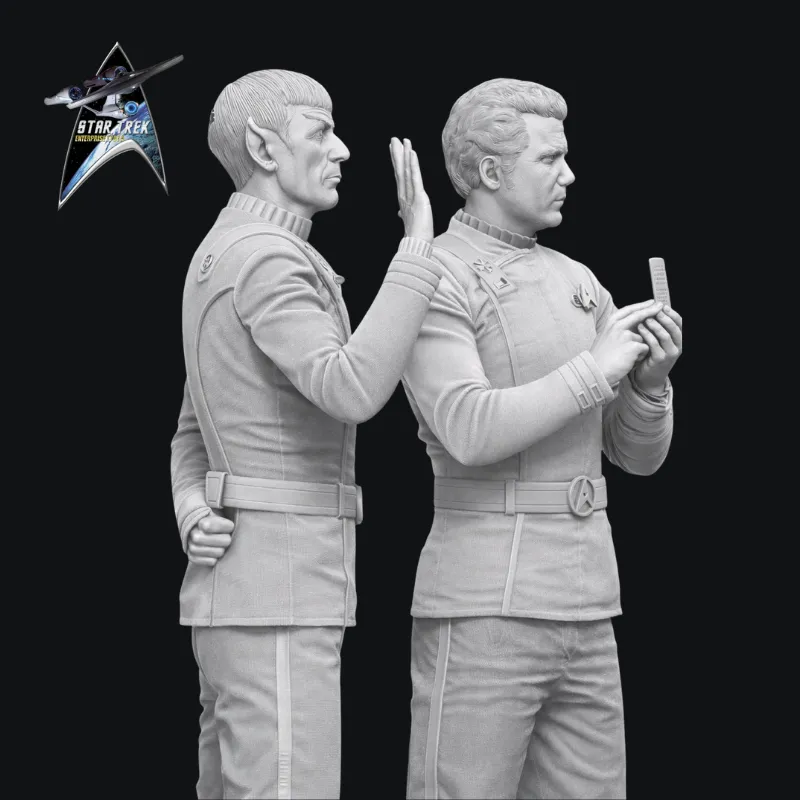 The sculpt presents both characters in classic Starfleet uniforms, standing side by side in a composed yet powerful pose that reflects duty, logic, and command. Facial likenesses, uniform textures, insignia details, and stance accuracy are meticulously crafted, making this piece a must-have for Star Trek collectors and painters alike.