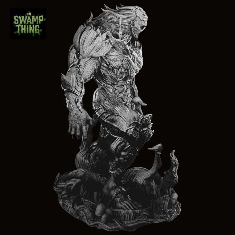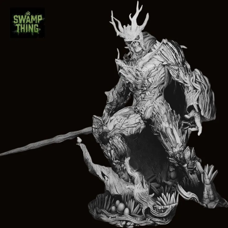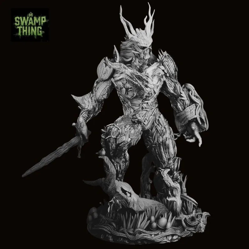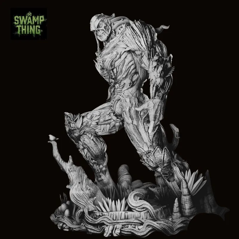 The sculpt showcases intricate vine layering, wood-grain textures, moss growth, and fungal details, delivering exceptional depth and realism. From the jagged, branch-formed weapon to the organically fused base, every element reinforces Swamp Thing’s primal connection to nature and his role as its ultimate protector.