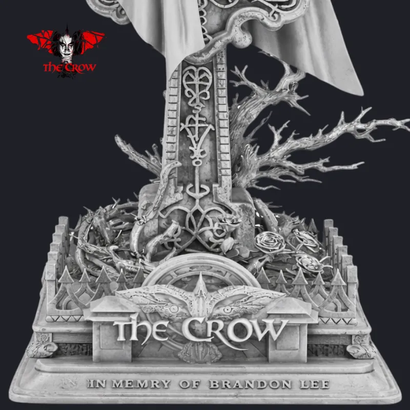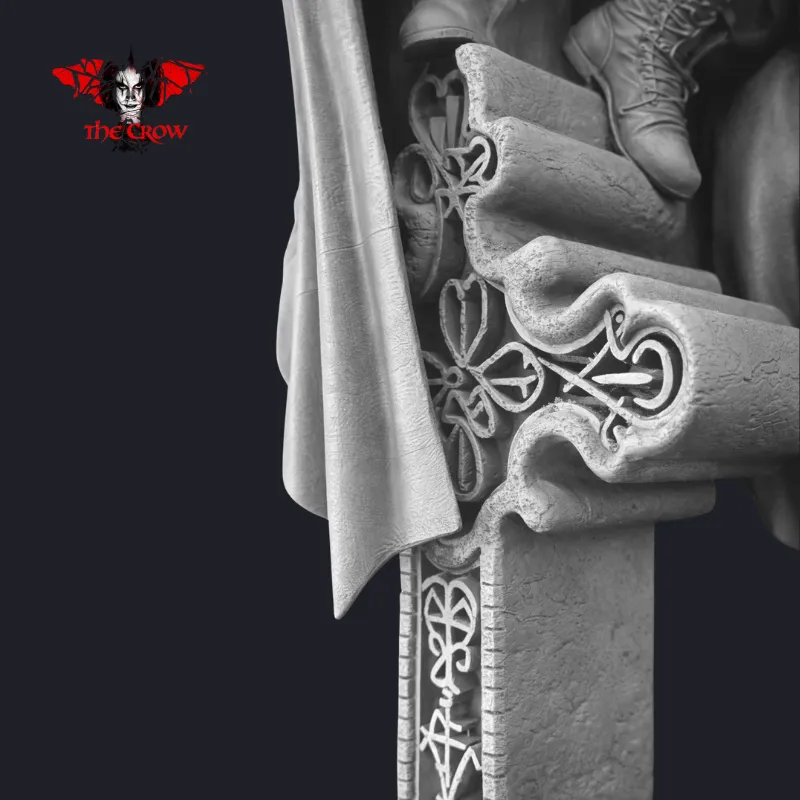 This highly detailed 3D model portrays The Crow perched atop a graveyard cross, cloak flowing in the darkness, with signature makeup, guitar, and symbolic elements woven into the base. From the intricate folds of the trench coat to the gothic architectural base adorned with roses and thorned branches, every detail is sculpted to evoke emotion, storytelling, and reverence.