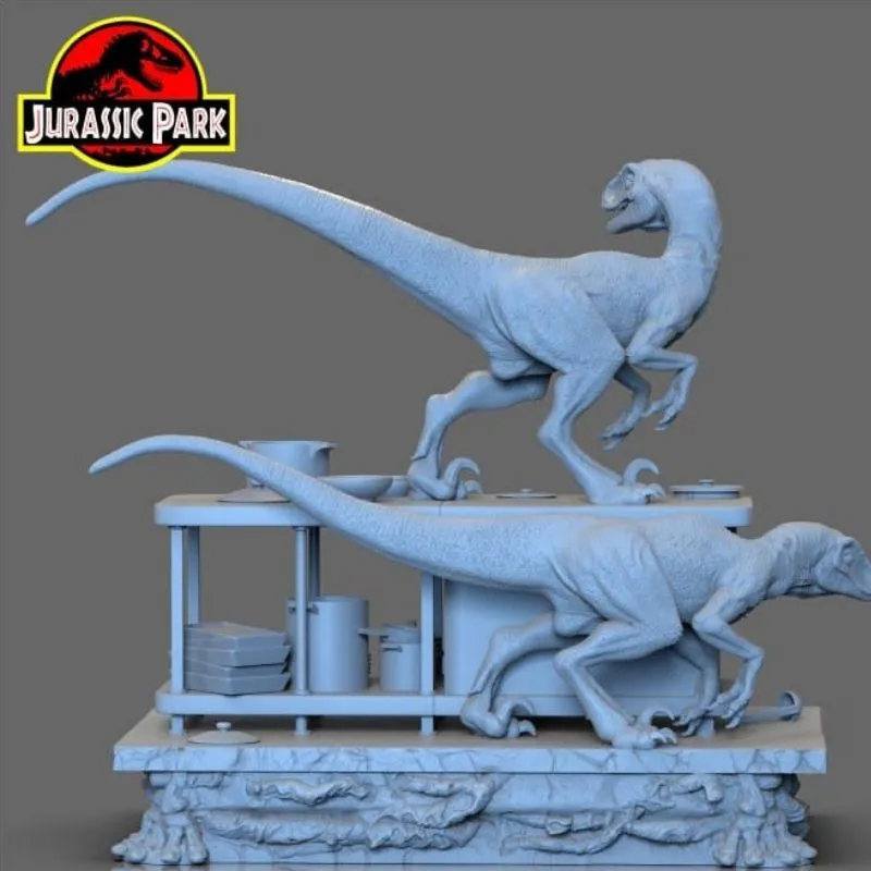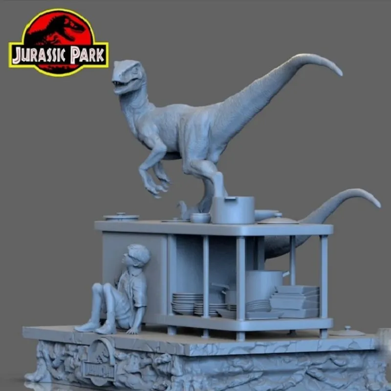 Relive one of the most iconic and heart-pounding scenes from Jurassic Park with this Velociraptors Kitchen Attack Diorama 3D Model. Featuring two hyper-detailed raptors stalking their prey inside the stainless-steel kitchen, this model perfectly captures the tension, suspense, and cinematic brilliance of the film’s unforgettable chase sequence.